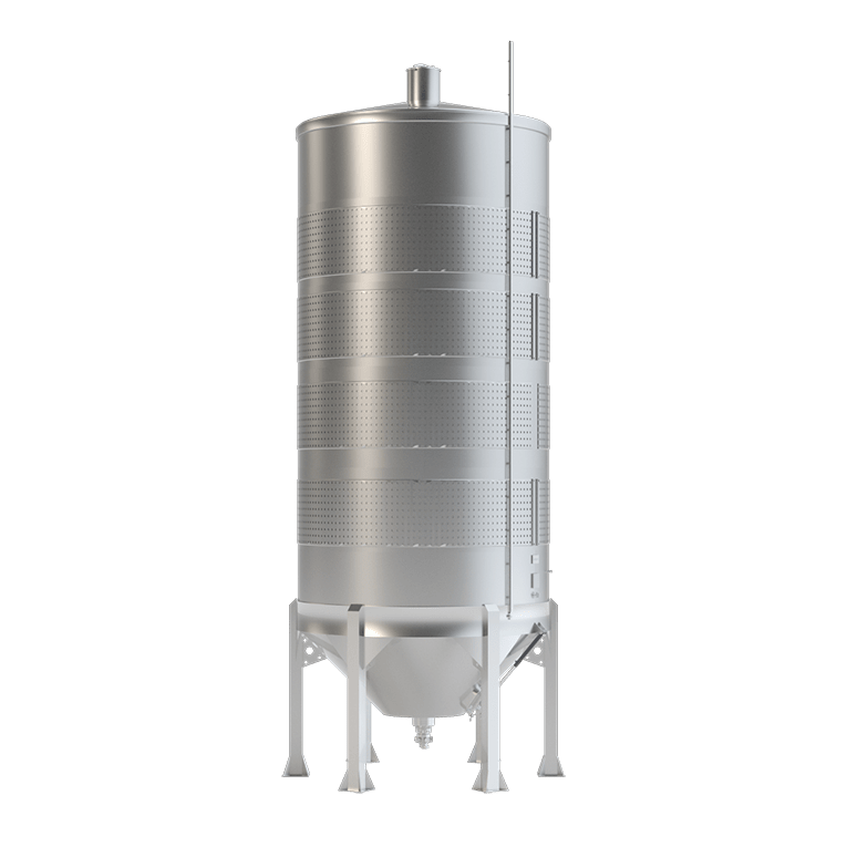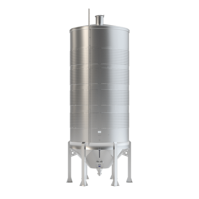 Cuba recomendada para fermentación y maceración. El fondo del tronco cónico está equipado con una hélice de extracción, que minimiza la necesidad de mano de obra para descargar las masas fermentadas.